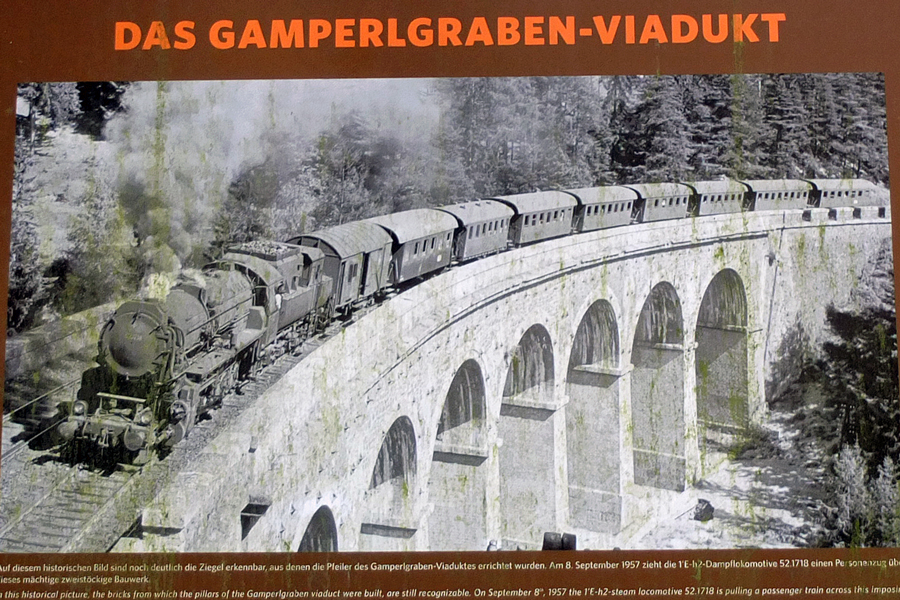 gibt es viele, interessante Informationstafeln, wie z.B. diese, welches das Gamperlgraben-Viadukt im Jahr 1957 mit einer alten