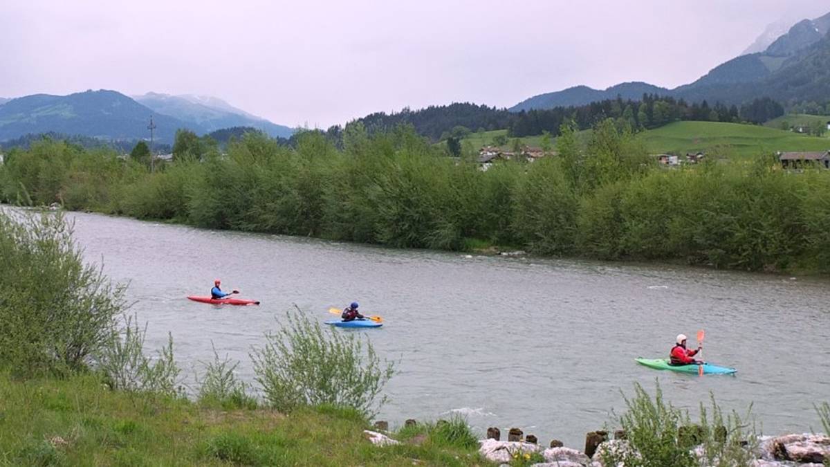 einem der beiden Dämme flussaufwärts in Richtung Kirchdorf in Tirol.