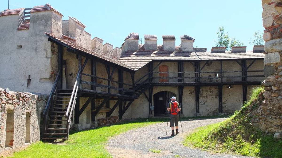 es steil hinauf zur Burg Kirchschlag, die sich auf einem 480 m hohen Berg