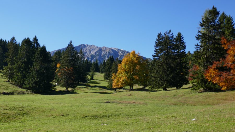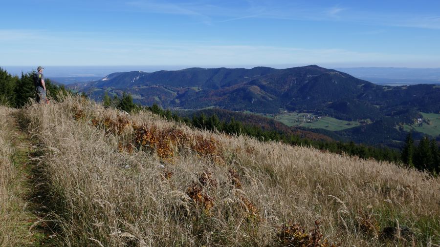 An einigen Stellen hatten wir einen wunderbaren Ausblick auf unseren weiteren Weg. Hinter der saftig grünen Mau-Mau-Wiese erheben sich die Gipfel von Schober (1213 m), Öhler (1183 m) und dem Katharinenschlag (1222 m).