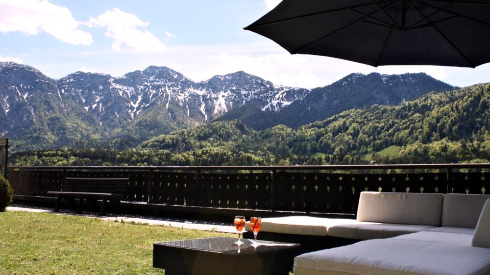 Von der Hotelterrasse blickten wir auf den eindruckvollen, 2.352 m hohen Grimming.