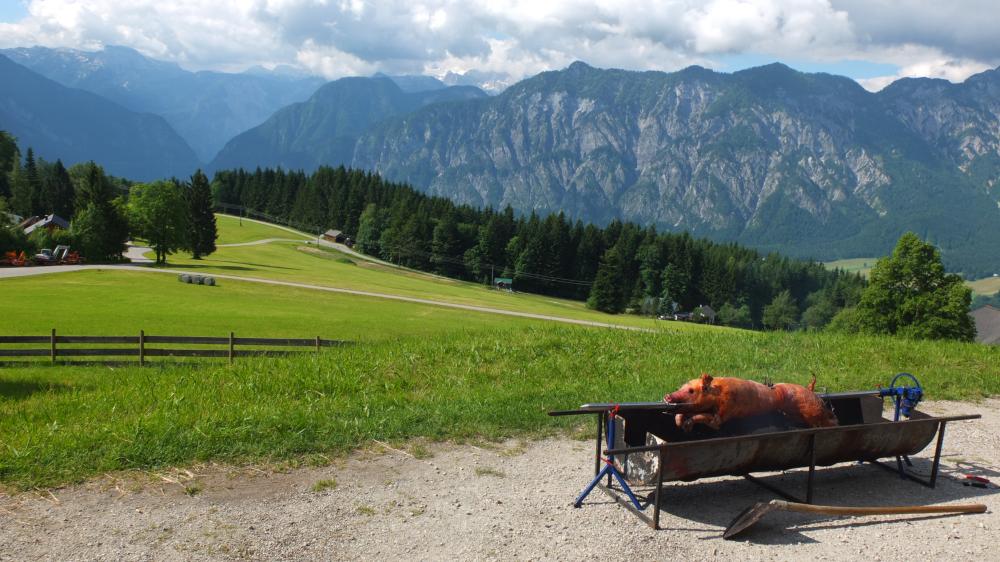 Unsere Wanderung begann beim Gasthaus Predigtstuhl auf einer Seehöhe von 973 m. Das Spanferkel, das sich bereits seit einiger Zeit über den glühenden Kohlen drehte, hatte leider nichts mehr von der phantastischen Aussicht.