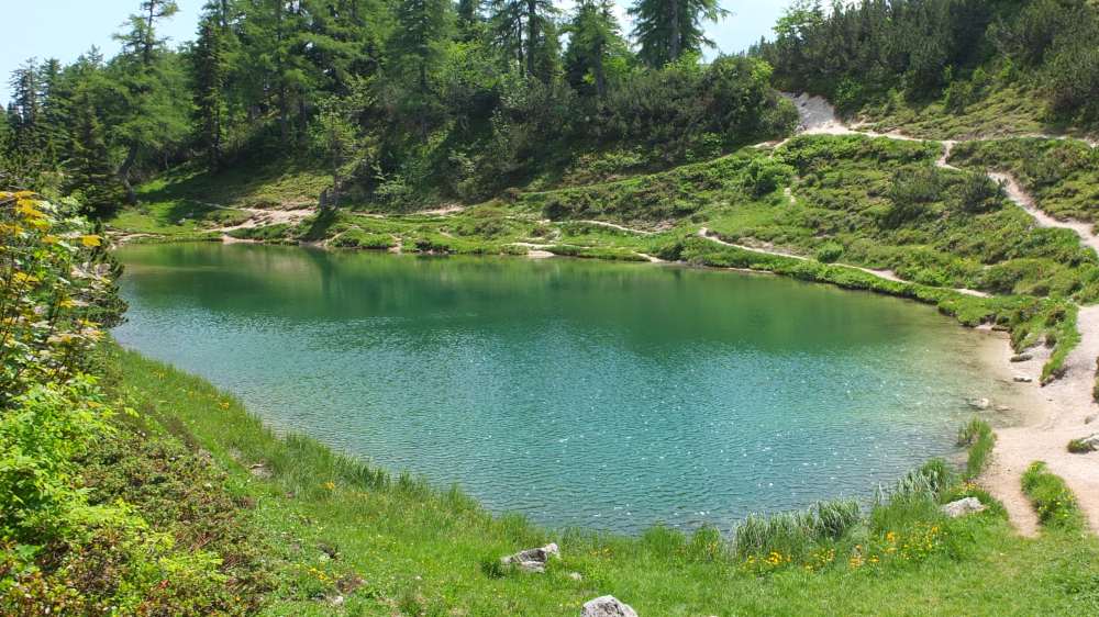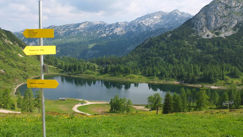 Von der "Erzherzog-Johann-Rast" hat man diese schöne Aussicht auf den Steirersee mit den Steirerseehütten.