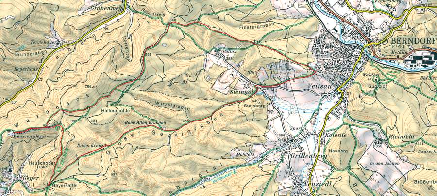 Der Rückweg führt über den Geyersattel und durch den Geyergraben, vorbei am "Roten Kreuz" zurück nach Berndorf.
