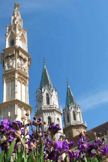 Hinter der gotischen Tutzsäule erkennt man die beiden 82 m hohe Türme der Klosterneuburger Stiftskirche.