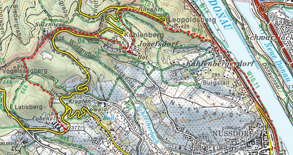 In seinem weiteren Verlauf führt die 1. Etappe vom Leopoldsberg auf den Kahlenberg, vorbei am Waldseilpark und vorbei ...