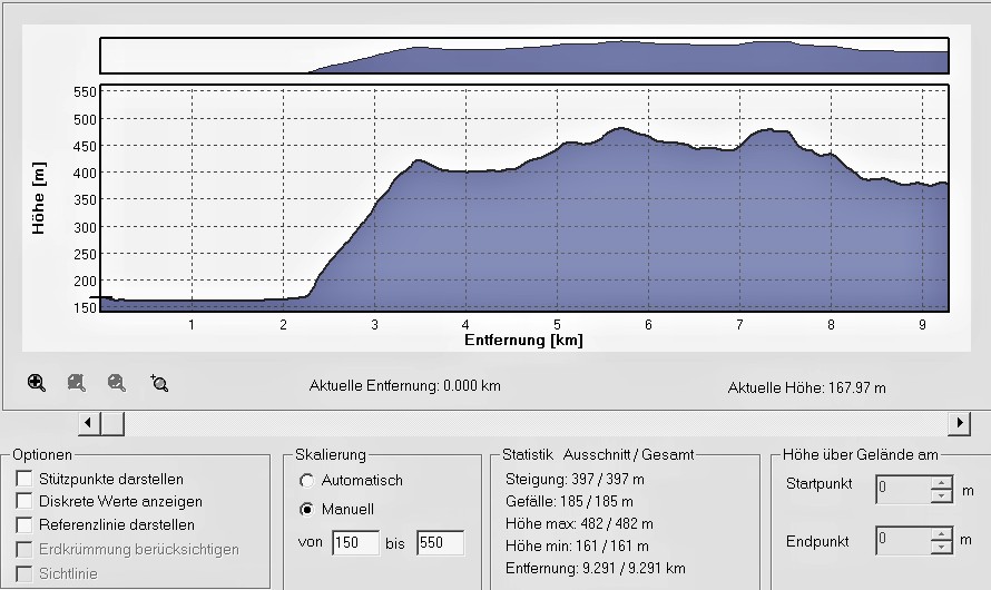 Die 1. Etappe hat eine Länge von 9,3 km und weist eine Steigung von 397 m und ein Gefälle von 185 m auf.