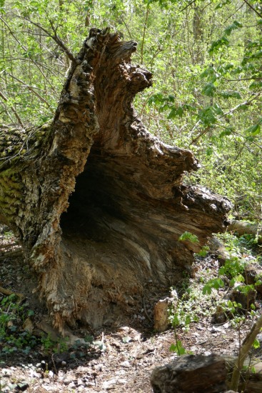 Immer wieder erblickt man am Wegrand umgestürzte, manchmal auch ausgehöhlte Bäume.