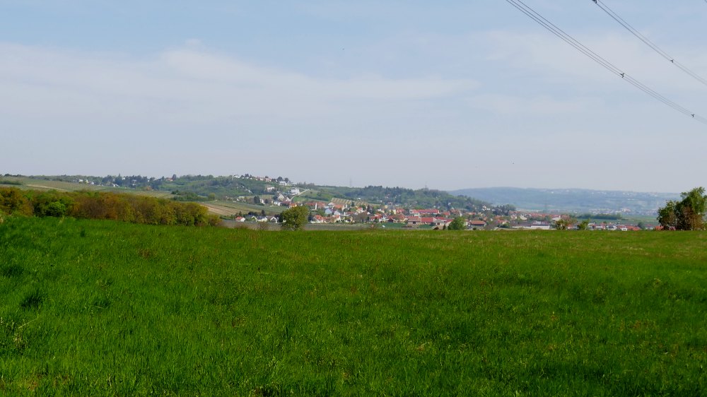 Über große Weingärten hinweg erblickt man im Südwesten den Wienerwald und Klosterneuburg.
