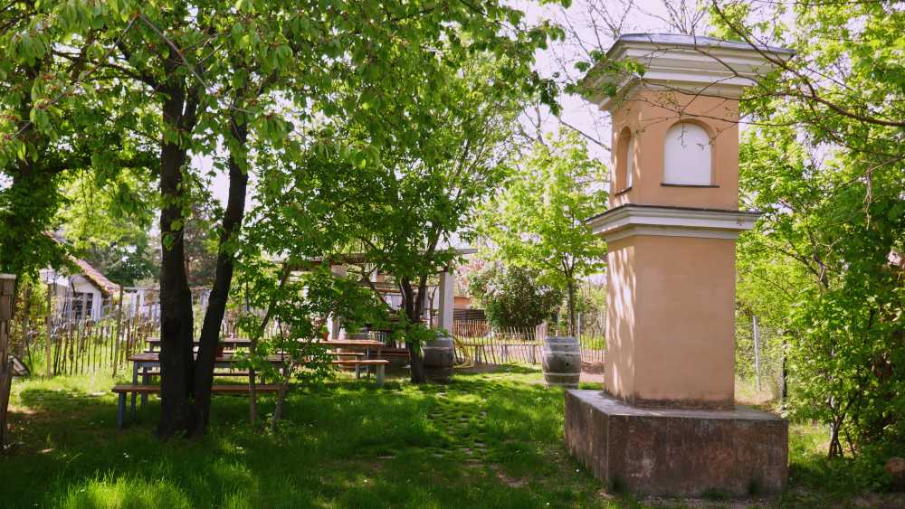 Am oberen Ende der Stammersdorfer Kellergasse befindet sich im Garten eines Heurigen das "steinerne Kreuz".