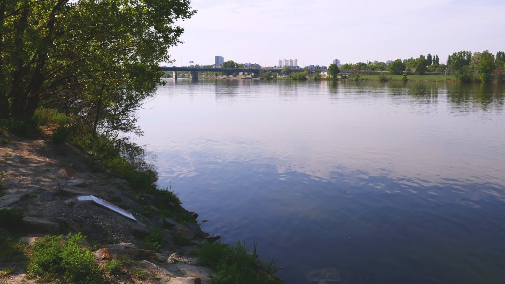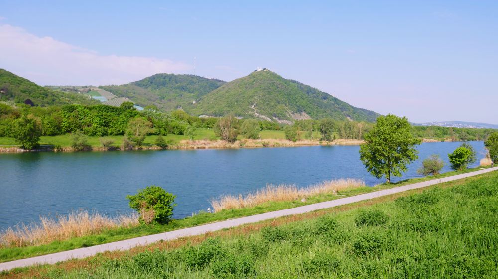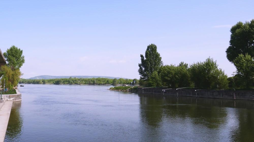 Kurz danach führt der Rundwanderweg auf den Hubertusdamm, von dem man auf die Neue Donau und den Leopoldsberg blickt.