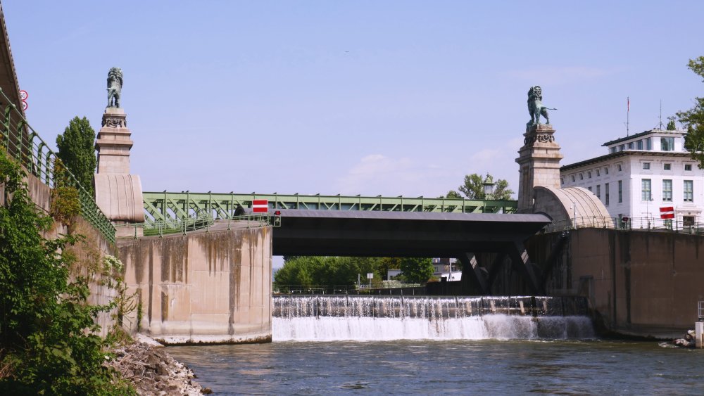 Bei der Schemerlbrücke strömt das Wasser der Donau über ein Wehr in den Donaukanal.